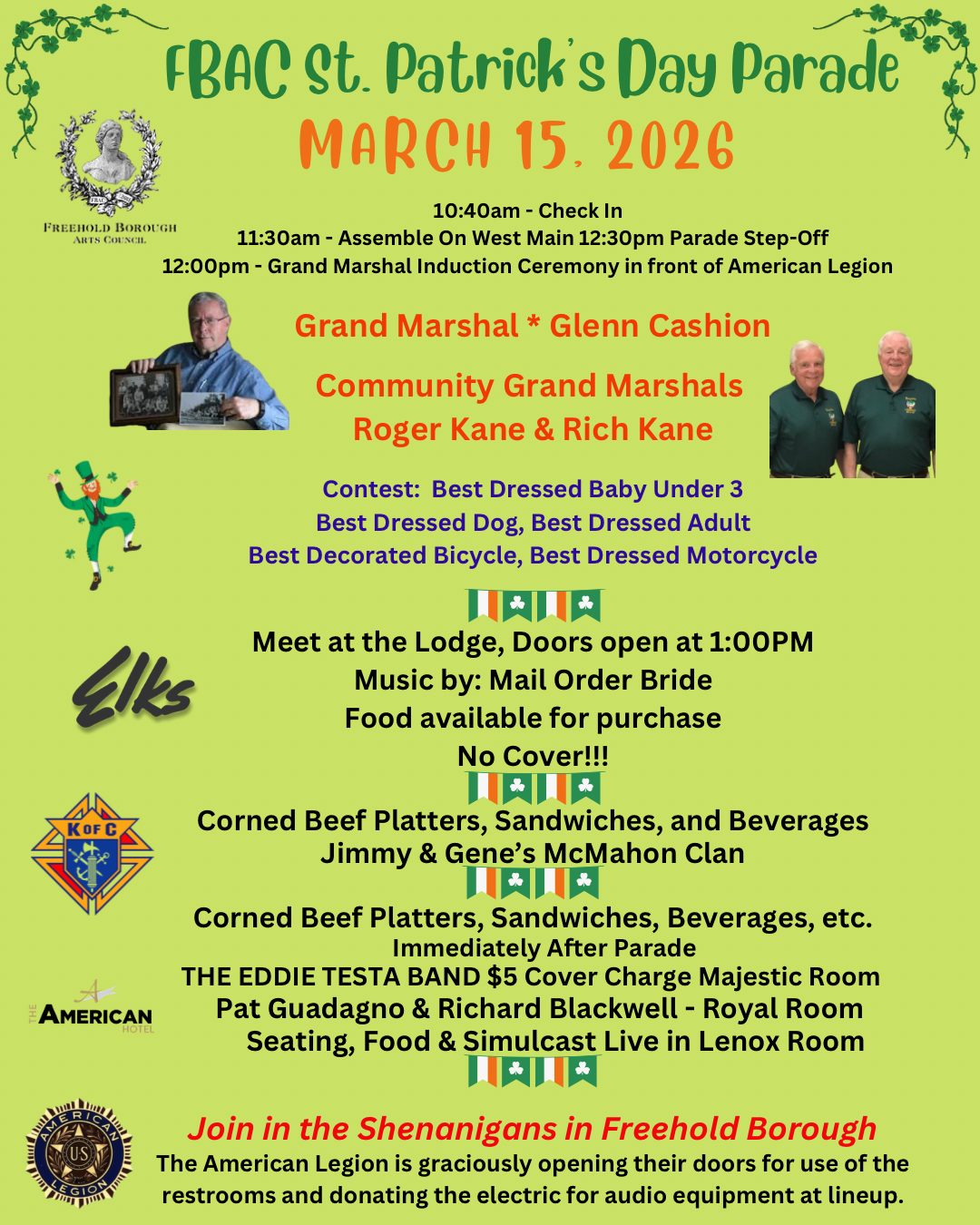 The parade route this year is packed with tons of fun and Irish tradition, as participants will march from McLean Street to the Elk’s Lodge. Thank you Freehold Borough Arts Council, the Ancient Order of Hibernians Div 16, the FBPD, Freehold Colombian Club, Freehold Elks and many others for making this all possible.